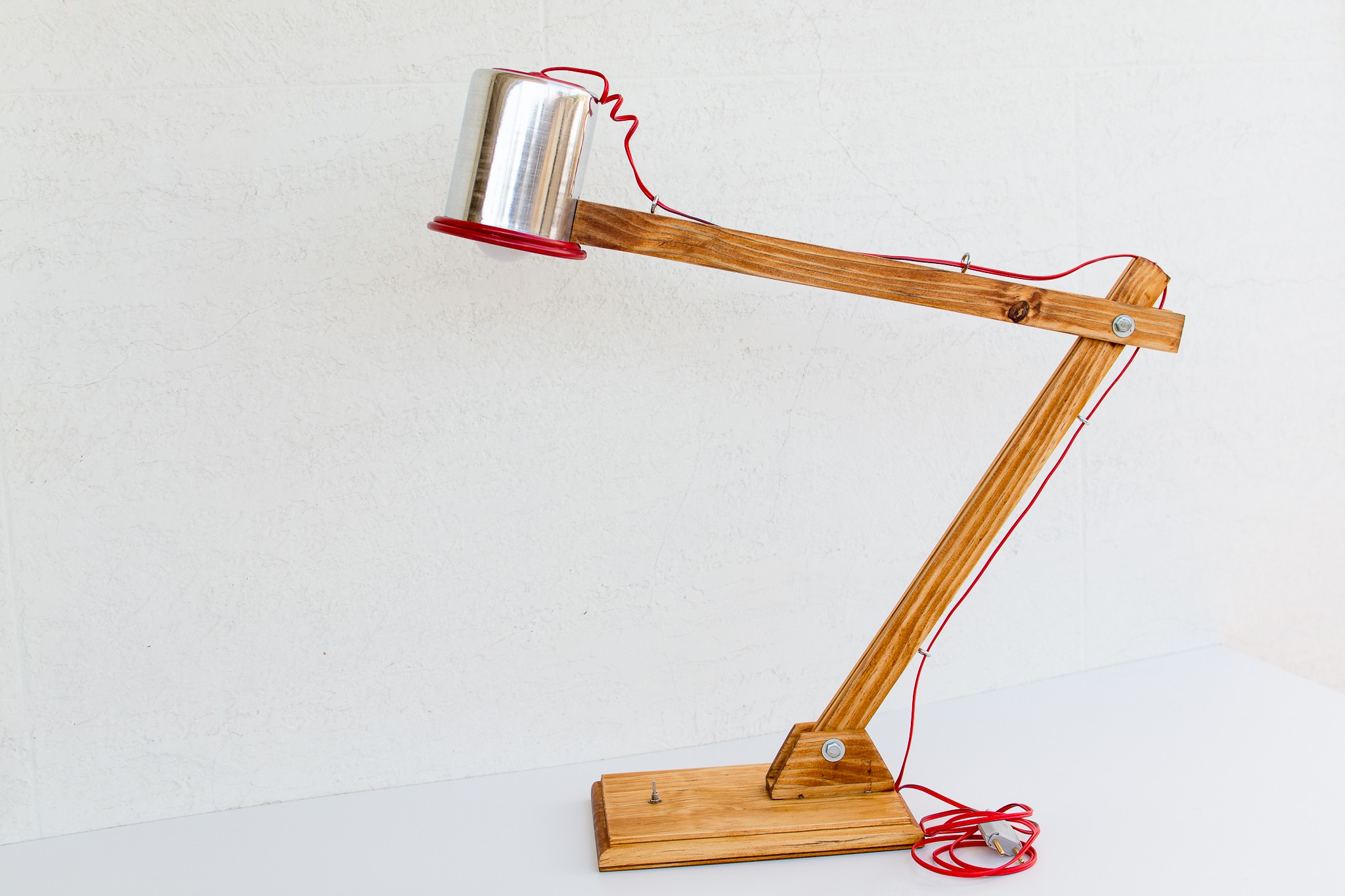Luminária artesanal de mesa, toda articulada, fabricada madeira de reflorestamento (pinus) com cúpula em alumínio e detalhes em plástico vermelho. Acabamento das seções articuladas em danish oil castanho claro (verniz dinamarquês) que deixa a madeira com acabamento suave ao toque e textura acetinada , Fiação de 1,5m, em cabo duplo flexível na cor vermelho, com chave liga/desliga na base e soquete tipo E27 (padrão). Aceita lâmpada 110 ou 220 v. Ideal para quem trabalha em home office ou executa desenhos ou trabalhos manuais à noite.