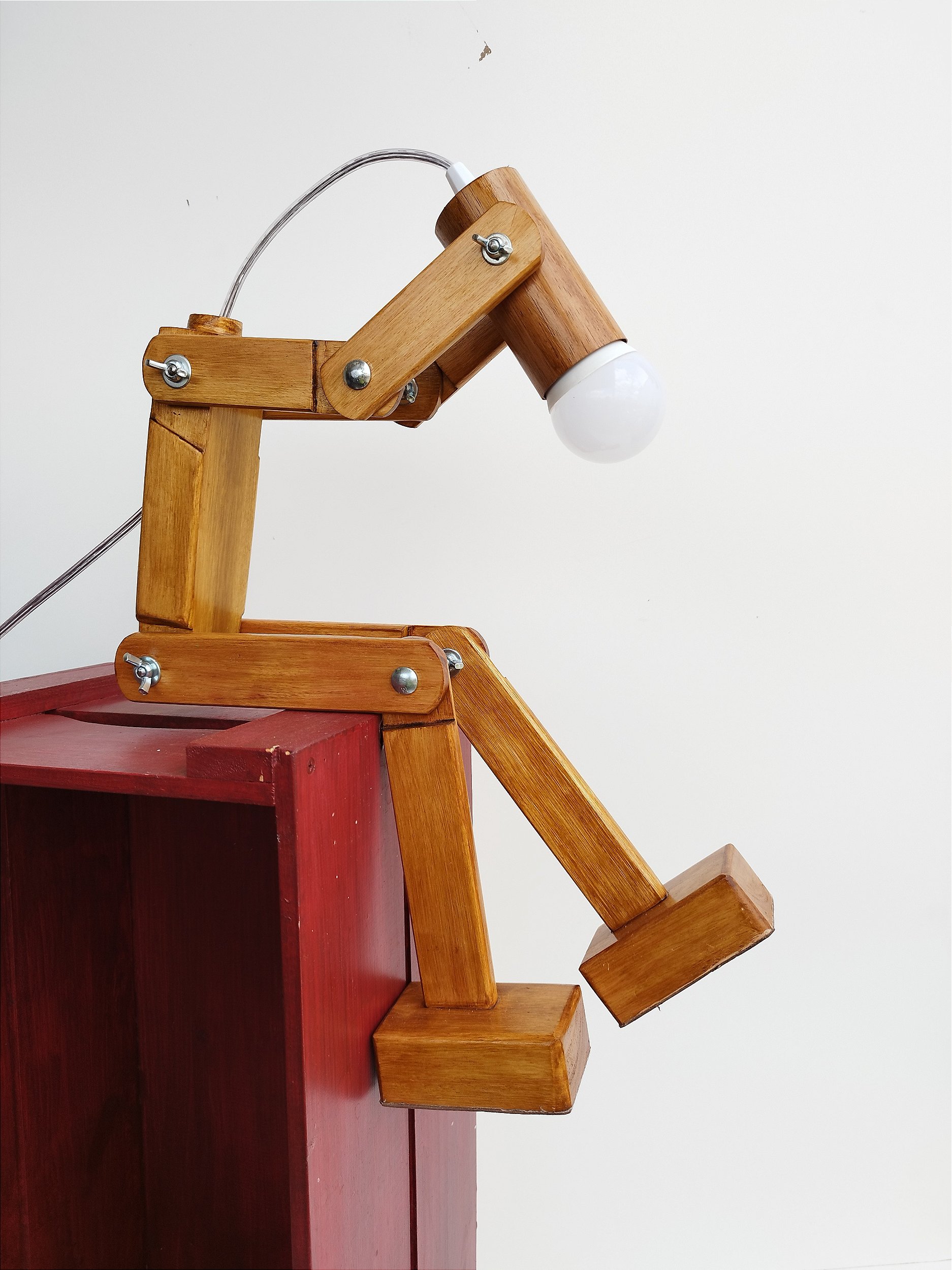 Luminária artesanal toda articulada, fabricada em madeira de reflorestamento (Eucalipto), acabamento em verniz na cor imbuia acetinado , Fiação em cabo PP silicone translúcido, com 1,70m útil, com apagador e soquete tipo E27 (padrão). A LÂMPADA NÃO ACOMPANHA A LUMINÁRIA. Produto único de fabricação artesanal. A meninada vai amar essa luminária divertida e versátil.