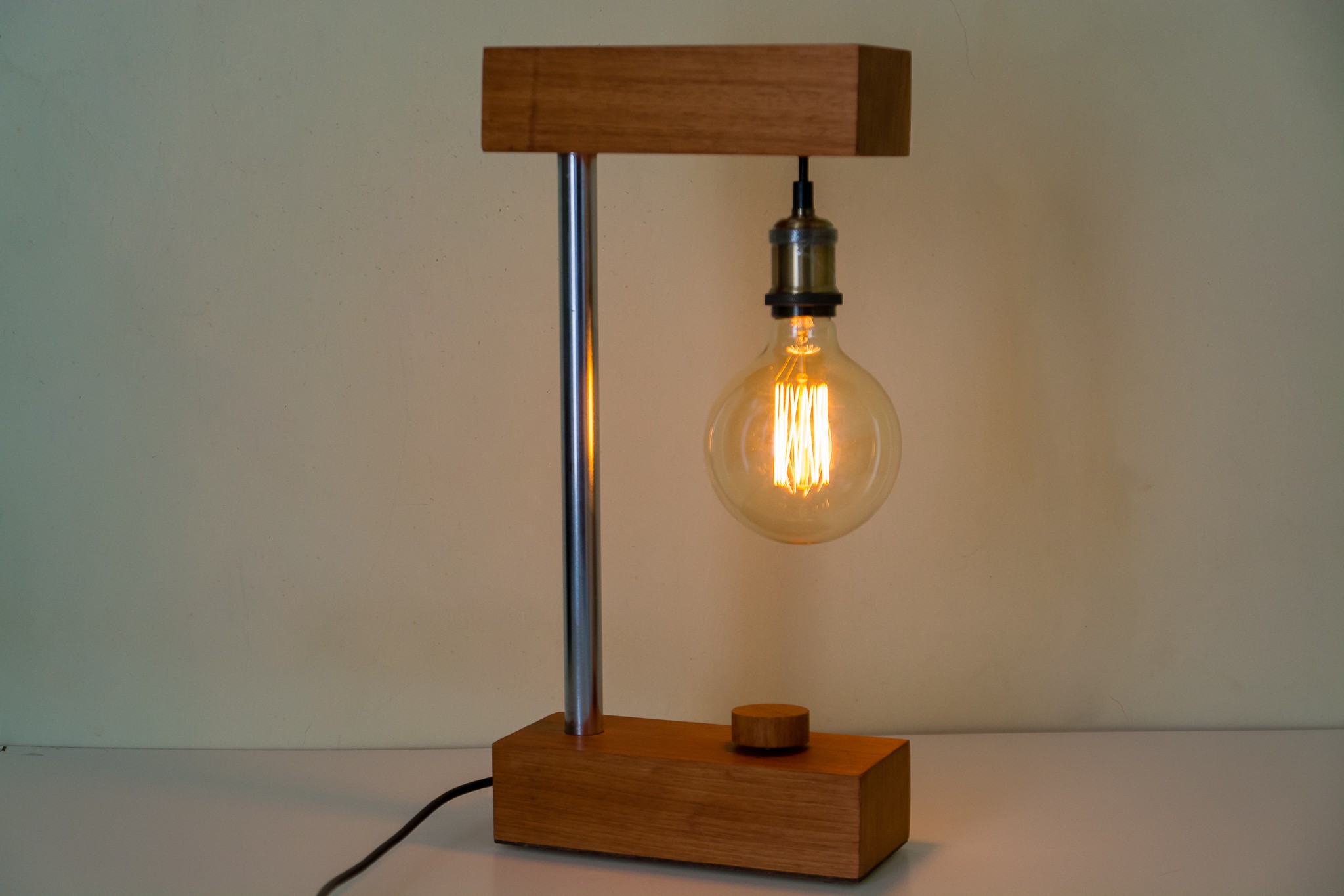 Um requinte de luminária, produzida em madeira de reflorestamento com acabamento em laminado de jequitibá, estrutura e tubo de aço cromado de 1 polegada (25,40mm), com dimmer bivolt (110/220 v) para controle da intensidade da luz, possibilitando criar um ambiente com atmosfera aconchegante. Fiação em cabo PP, toda embutida. Mesmo quando não em uso, torna-se uma harmoniosa peça de decoração.