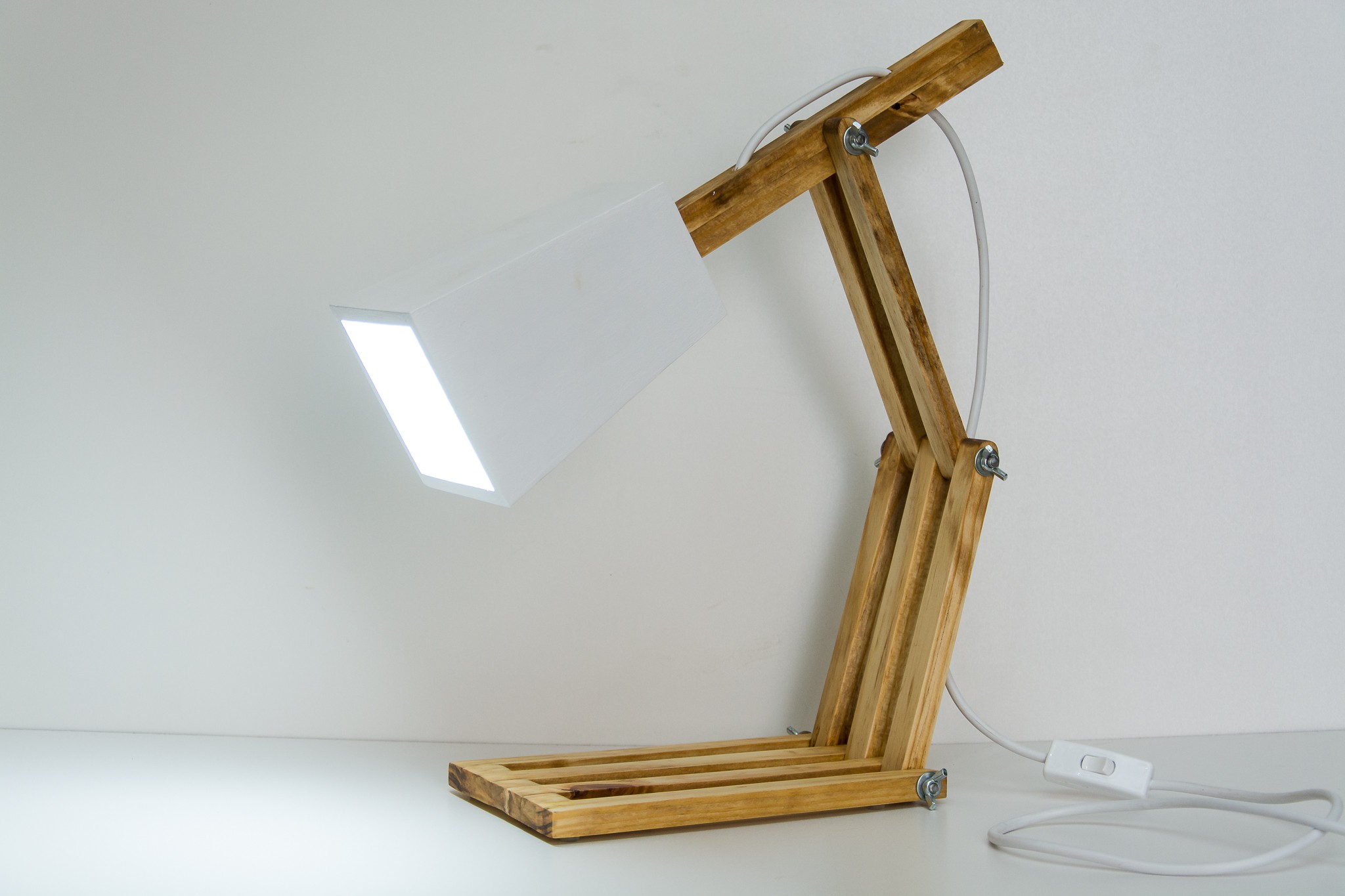 Luminária artesanal de mesa, com 3 seções de articulação, fabricada em madeira de reflorestamento pinus e compensado naval (cúpula), acabamento das seções articuladas em danish oil (óleo dinamarquês) que deixa a madeira com acabamento suave ao toque e acetinado ressaltando os seus veios, A cúpula pode ser pintada na cor desejada pelo cliente. A base recebe proteção em silicone, para não arranhar seu móvel. Fiação útil de 1,5m, em cabo PP, com apagador e soquete tipo E27 (padrão), podendo receber lâmpadas de 110 ou 220v. A LÂMPADA NÃO ACOMPANHA A LUMINÁRIA. Produto único de fabricação artesanal.
