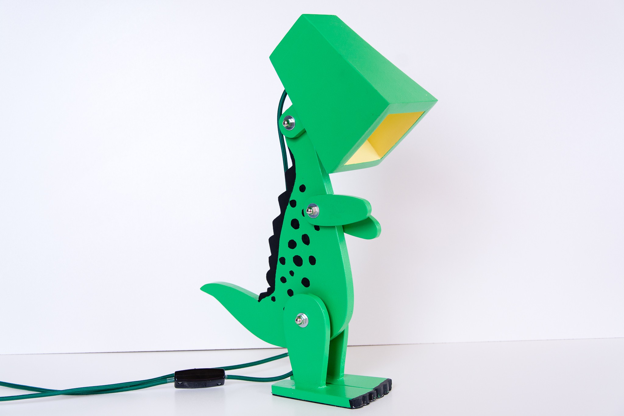 Luminária artesanal Infantil, toda articulada, fabricada em compensado pintado. .Pés emborrachados em EVA para maior aderência à superfície e evitar arranhões. Fiação em cabo PP, forrado em tecido verde, com apagador e bocal em cerâmica tipo E27 (padrão). Acompanha lâmpada de 110 v, mas pode ser substituída por 220 v. Produto exclusivo, de fabricação artesanal. Fotos reais do produto.